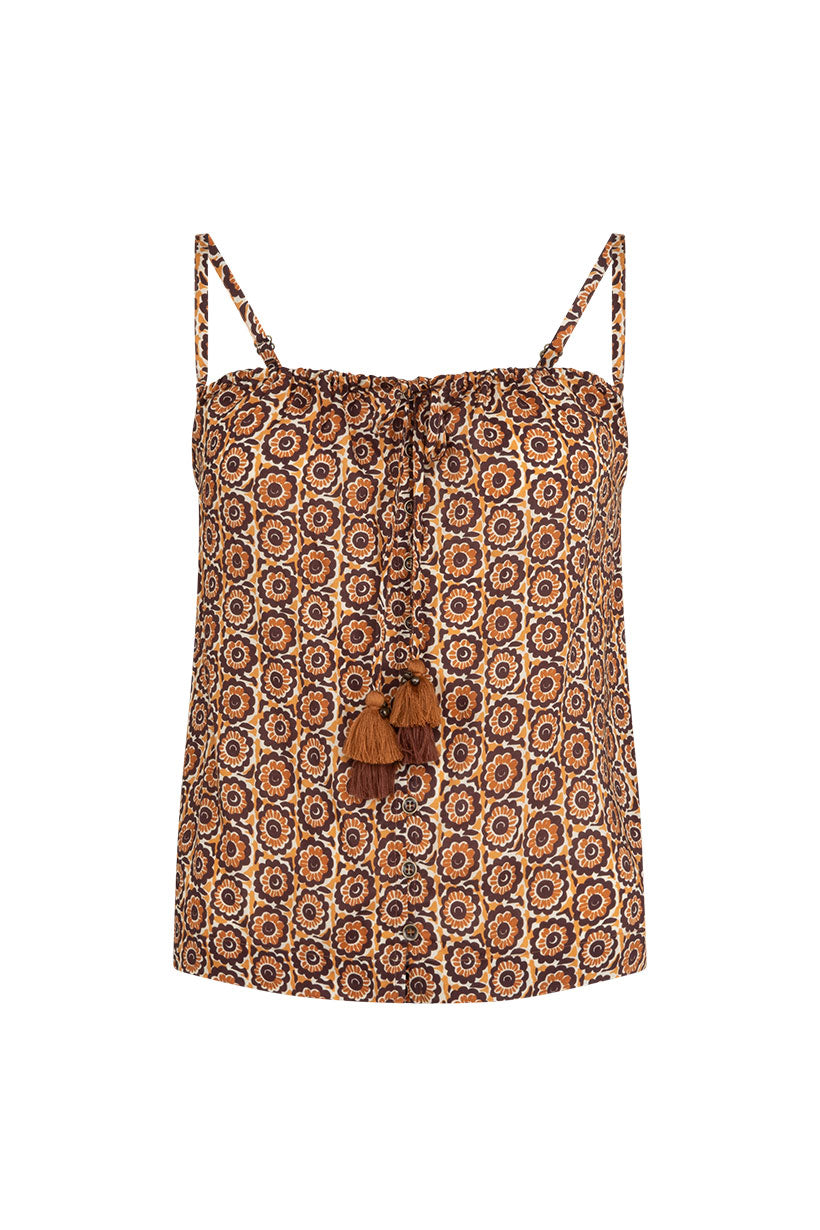 Get ready to turn heads in the Sannah Cami in Golden Ochre. The allover print exudes confidence and a hint of rebellion, while the front ties and elastic back provide a flattering and customizable fit. With adjustable straps, this cami is sure to become your new go-to for any occasion.